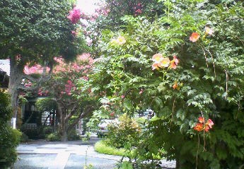 本覚寺では百日紅や蓮、凌霄花が咲いています。
